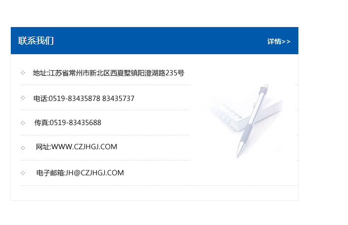 傳真:0519-83435688    郵編:213135    網址:WWW.czjhgj_com.xfxpt.com    電子郵箱:JH@czjhgj_com.xfxpt.com